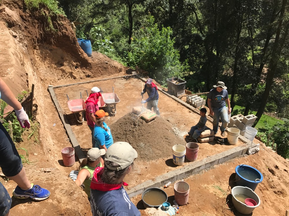 Annette and I and the Robersons’ were on this slab crew. We were joined by Bethel employees Juanito and Jorge and Bethel Summer Intern, Brittany. What a great crew! Slab work is tough! First off the home site was on top of a hill that had a narrow steep path for access! The area where we worked was a space only about 16 x 26 (with the foundation taking up 14×24)! What a view!