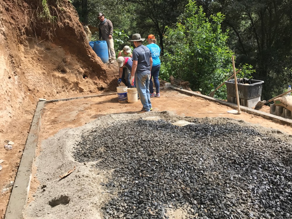 So, the raw materials for the slab are: sand, rock, water and concrete mix. We were happy that the rock and sand had been delivered prior to our project start time. However, we had to mix this by hand with shovels and hoes. The sand was in one location and had to be moved by bucket about 30 feet down a steep embankment. The rock had to be moved by bucket up a steep embankment about 50 feet too!