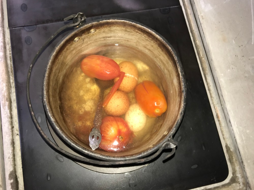Saul translated that today Maria, her 2 teen sons, 2 grown daughters and 4 little grandkids who all live in this house would eat ONLY tortillas that she will make from the masa. And in the pot, she had water, 3 small tomatoes, and 3 eggs that she would boil with the tomatoes.