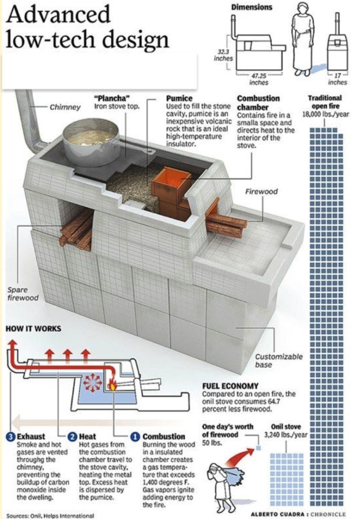 By replacing their existing stove with the Onil, the smoke is vented, thus helping the health of the family. It also is extremely efficient! It has a small firebox where only a few sticks of wood can burn at a time. A few sticks can cook an entire meal. One new upgrade to the ONIL design is in the top cement portion, there is a large firebrick piece that replaces the pumice that is noted in the diagram below. This guides the heat and smoke along the cook surface and out to the vent pipe. The beauty of this firebrick piece is that it retains the heat for many hours. It is generally warm the next day….thus greatly increasing the efficiency of the stove!
